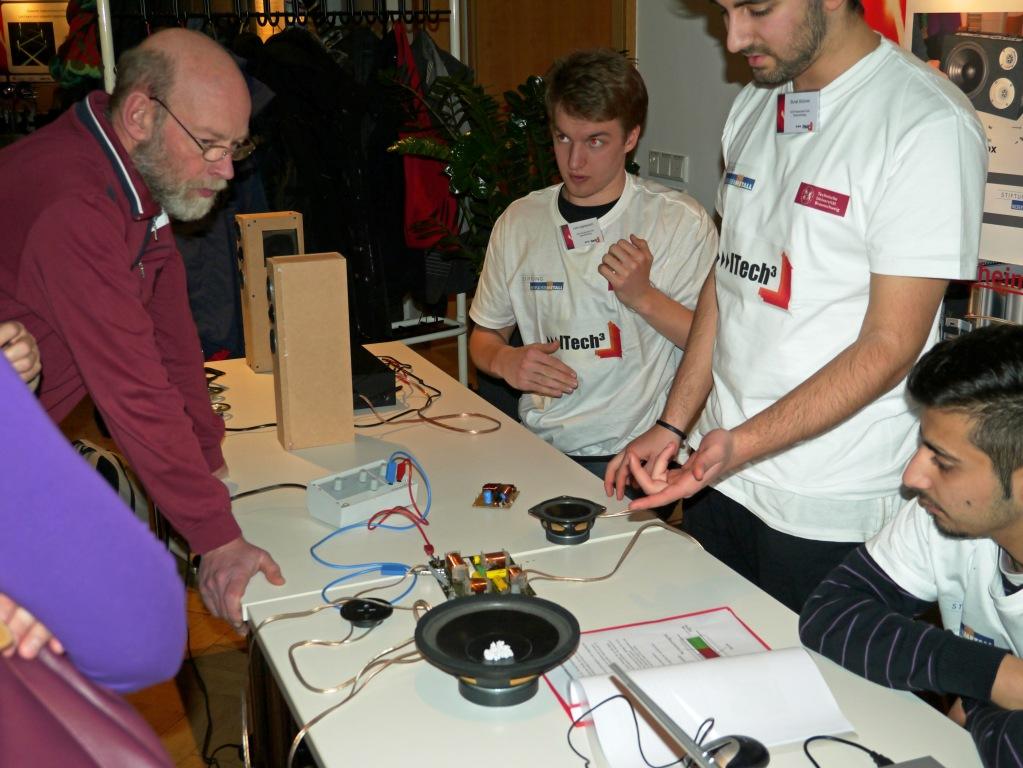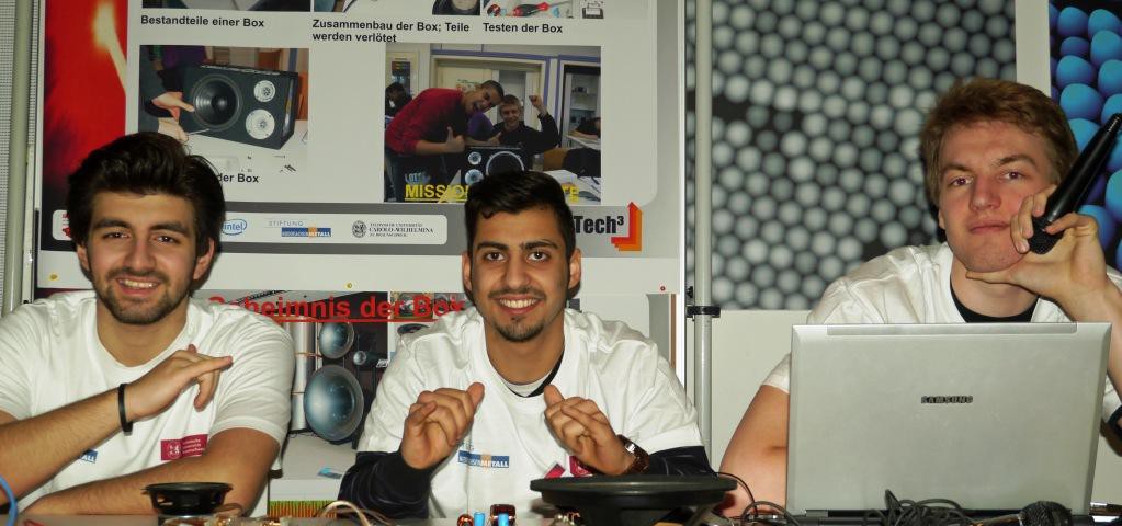 Gruppe Tontechnik (Burak, Kevin, Lars, Özgür): Vom Mikrofon über die Tonbearbeitung bis hin zur selbst gebauten Lautsprecherbox.