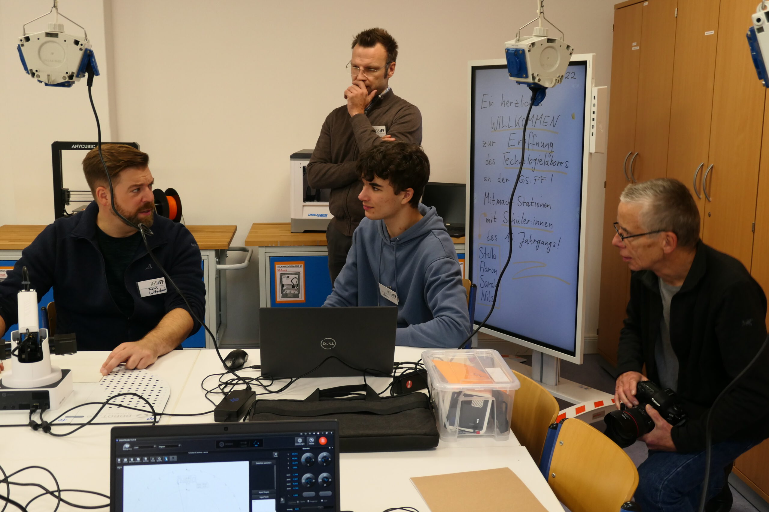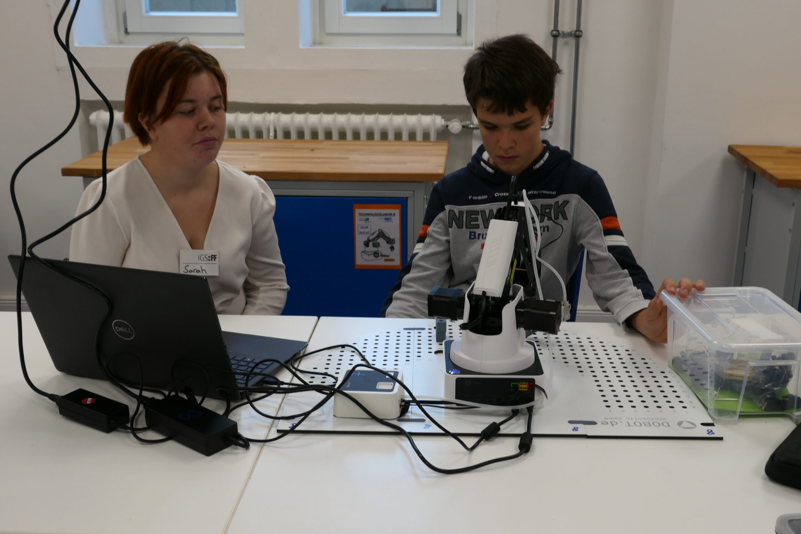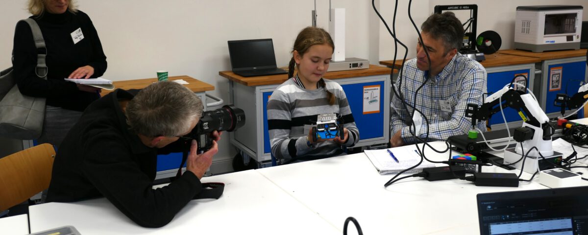 Am Eröffnungstag konnten schon die Jugendlichen aus dem TW – Kurs 10 von Herrn Hilpert unsere Gäste von dem motivierenden Umgang mit den Roboterarmen und deren ansprechenden Software Dobot-Studio überzeugen. Stella, Aaron, Nils und Sarah hatten nicht nur die Maschinen im Griff. Fachlich versiert erklärten sie unseren Gästen die Technik. Herr Felbermair, unser Betreuungslehrer für dieses Projekt aus Hannover war da genauso erstaunt wie Herr Müller von unserer BBS Partnerschule, der Heinrich-Büssing-Schule. Kein Wunder also, dass sich diese Veranstaltung über unsere Schulmauern hinweg rumgesprochen hatte. Die Presse kam zahlreich. Frau Dartsch von der Braunschweiger Zeitung brachte gleich einen Fotografen mit und Zoe interviewte für unsere Schülerzeitung fleißig den gesamten Vormittag lang. Bei Kaffee und Keksen verirrte sich so mancher neugierige Mensch zu uns in den Keller und schnupperte moderne Technologieluft. Nun hoffen wir auf eine zahlreiche und regelmäßige Buchung, damit die Roboter nicht einrosten. Abschließend danken wir ganz herzlich allen Mitarbeiter:innen und Betreuer:innen der n-21- Initiative Masterplan Digitalisierung – Technologielabor. Besser kann man digitale Bildung nicht voranbringen.