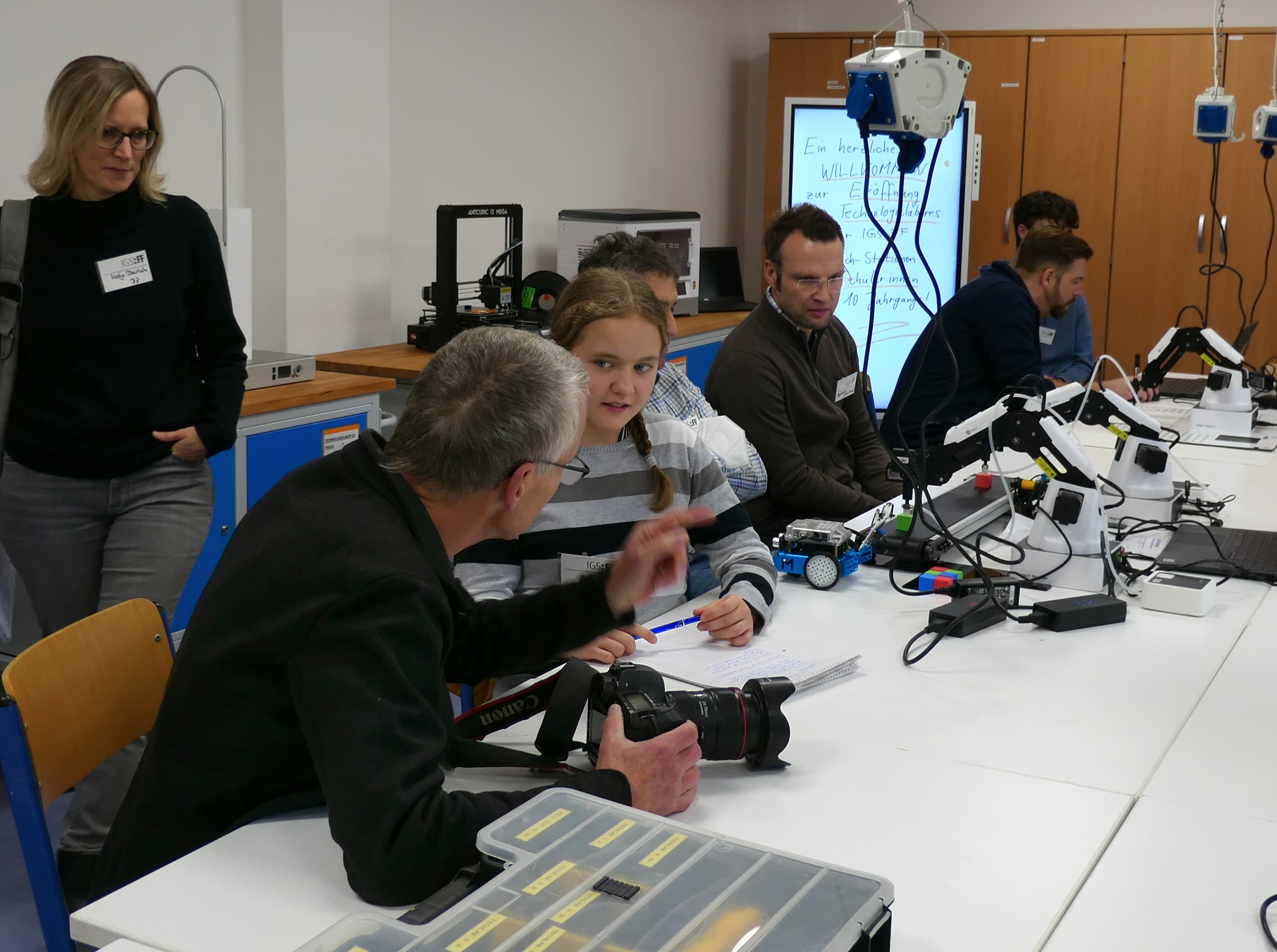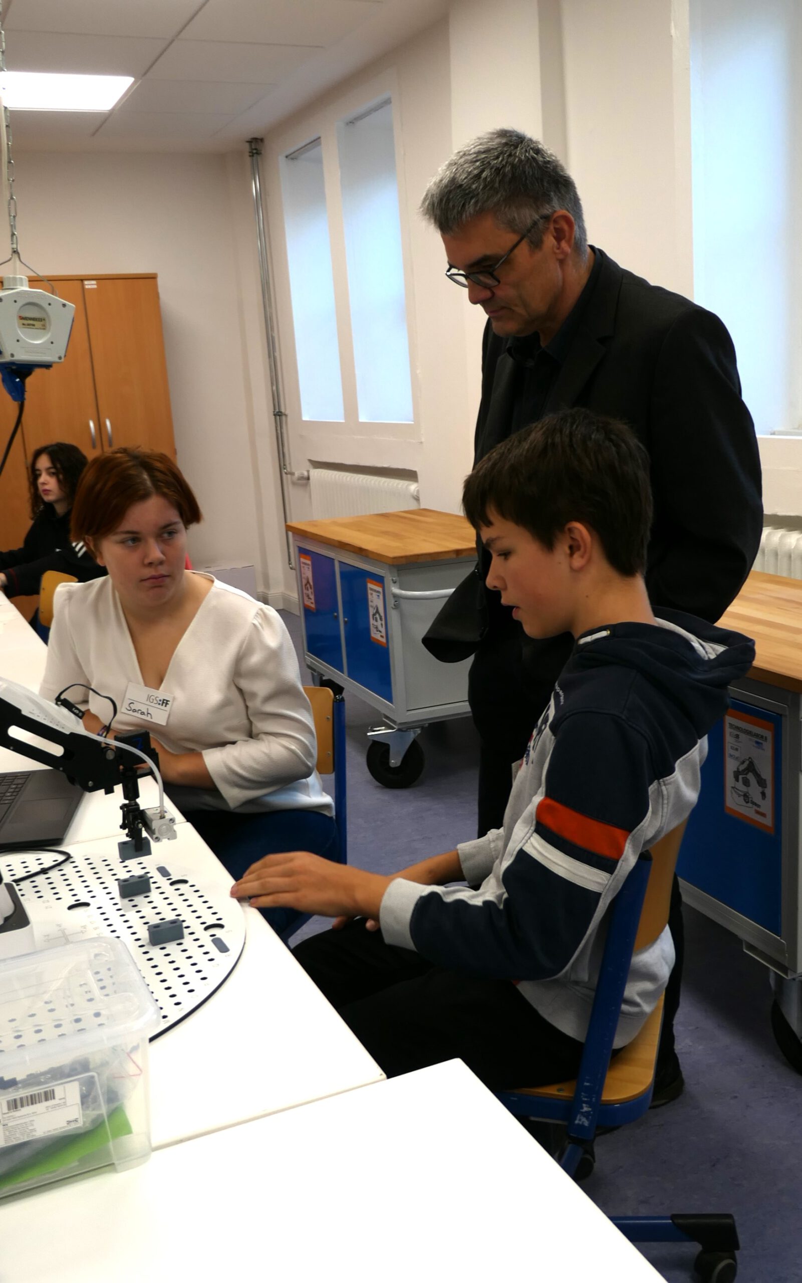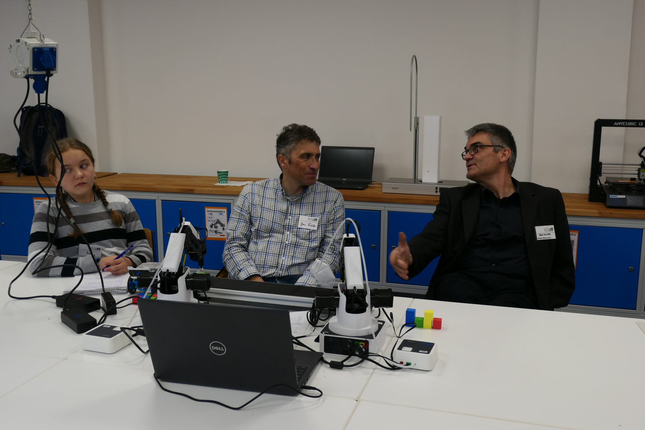 Am Eröffnungstag konnten schon die Jugendlichen aus dem TW – Kurs 10 von Herrn Hilpert unsere Gäste von dem motivierenden Umgang mit den Roboterarmen und deren ansprechenden Software Dobot-Studio überzeugen. Stella, Aaron, Nils und Sarah hatten nicht nur die Maschinen im Griff. Fachlich versiert erklärten sie unseren Gästen die Technik. Herr Felbermair, unser Betreuungslehrer für dieses Projekt aus Hannover war da genauso erstaunt wie Herr Müller von unserer BBS Partnerschule, der Heinrich-Büssing-Schule. Kein Wunder also, dass sich diese Veranstaltung über unsere Schulmauern hinweg rumgesprochen hatte. Die Presse kam zahlreich. Frau Dartsch von der Braunschweiger Zeitung brachte gleich einen Fotografen mit und Zoe interviewte für unsere Schülerzeitung fleißig den gesamten Vormittag lang. Bei Kaffee und Keksen verirrte sich so mancher neugierige Mensch zu uns in den Keller und schnupperte moderne Technologieluft. Nun hoffen wir auf eine zahlreiche und regelmäßige Buchung, damit die Roboter nicht einrosten. Abschließend danken wir ganz herzlich allen Mitarbeiter:innen und Betreuer:innen der n-21- Initiative Masterplan Digitalisierung – Technologielabor. Besser kann man digitale Bildung nicht voranbringen.