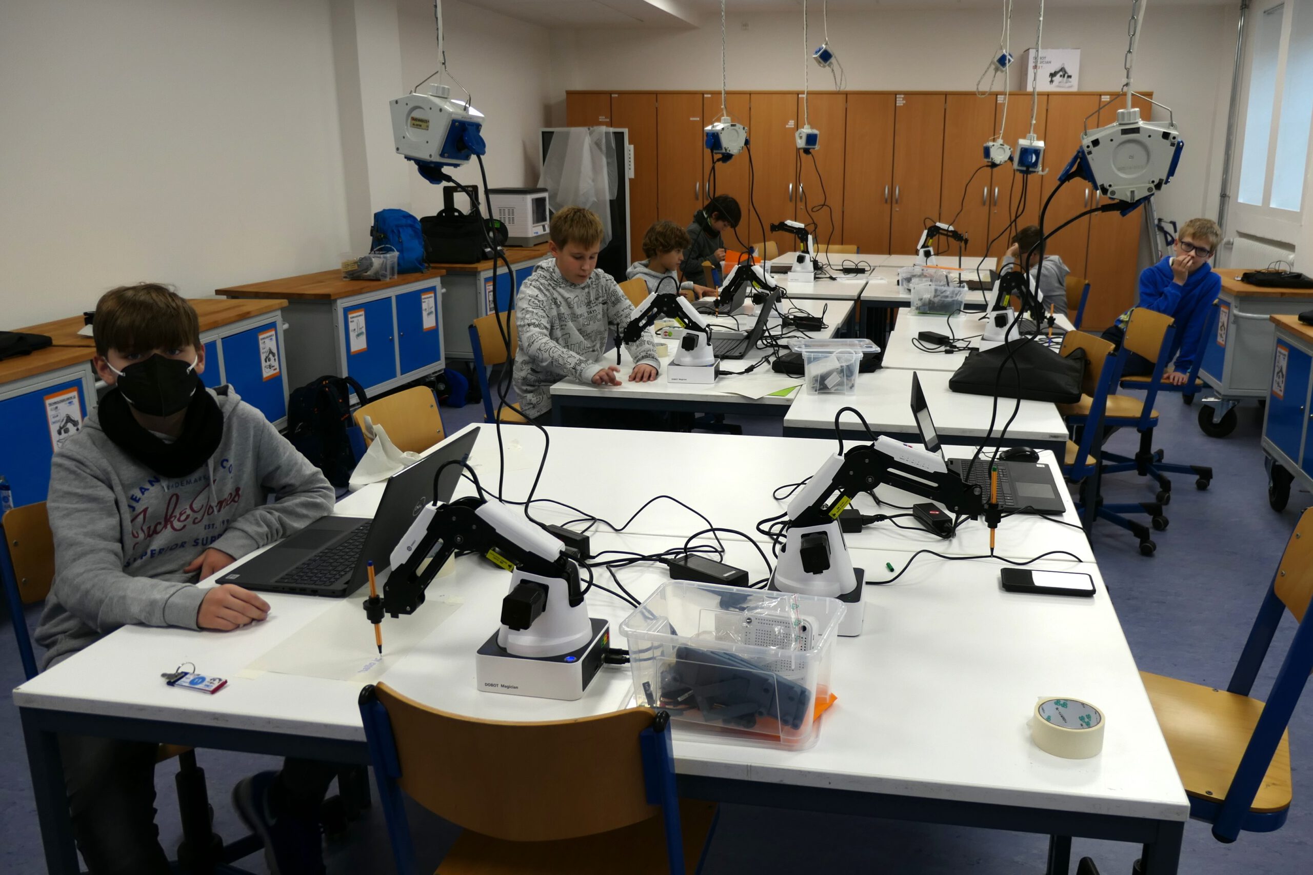Aber der Reihe nach! Im Dezember 2020 – quasi als vorverlegtes Weihnachtsgeschenk – bekam unsere Planungsgruppe Technologielabor (Frau Klasmeyer, Herr Hilpert, Herr Heydecke, Herr Fröde, Herr Lutterbeck, Herr Henkel und Herr Bock) grünes Licht von der N-21-Initiative Mensch – Roboter – Kollaboration – Robonatives. Unsere drei Beweggründe kamen gut an. Wir wollten einen modernen AWT-Unterricht ermöglichen, dem Fach Informatik eine Handlungsmöglichkeit geben und unsere Schule, speziell das Technologielabor, allen Schulen Braunschweigs als Lernort anbieten. Nun ist es offiziell soweit. 14 Roboterarme der Marke DOBOTS mit Greif-, Ansaug-, Schreib- und 3D-Druck-Werkzeug warten auf Schüler:innen aller Jahrgangsstufen und deren Programmierkünste. Tragt es weiter und überzeugt eure Lehrer:innen von einem Besuch bei uns in der Programmier-Höhle.