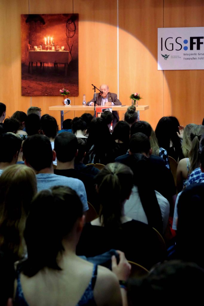 300 SchülerInnen der IGS:FF hörten schweigend und aufmerksam zu, als Sally Perel über den Abschied von seinen Eltern, von den Erlebnissen in der Hitlerjugend als Hitlerjunge Josef erzählt, können aber auch schmunzeln, wenn er von seinen Jugendlieben spricht. Das Bedrückende ist, dass er als Zeitzeuge deutlich machen kann, dass sich eine „heile Welt“, die er als Kind erlebte, zu einem Alptraum entwickelte, dass sich Menschen – wie wir alle – sich so veränderten, dass Millionen von Menschen getötet wurden – nicht von Monstern, sondern von Menschen!