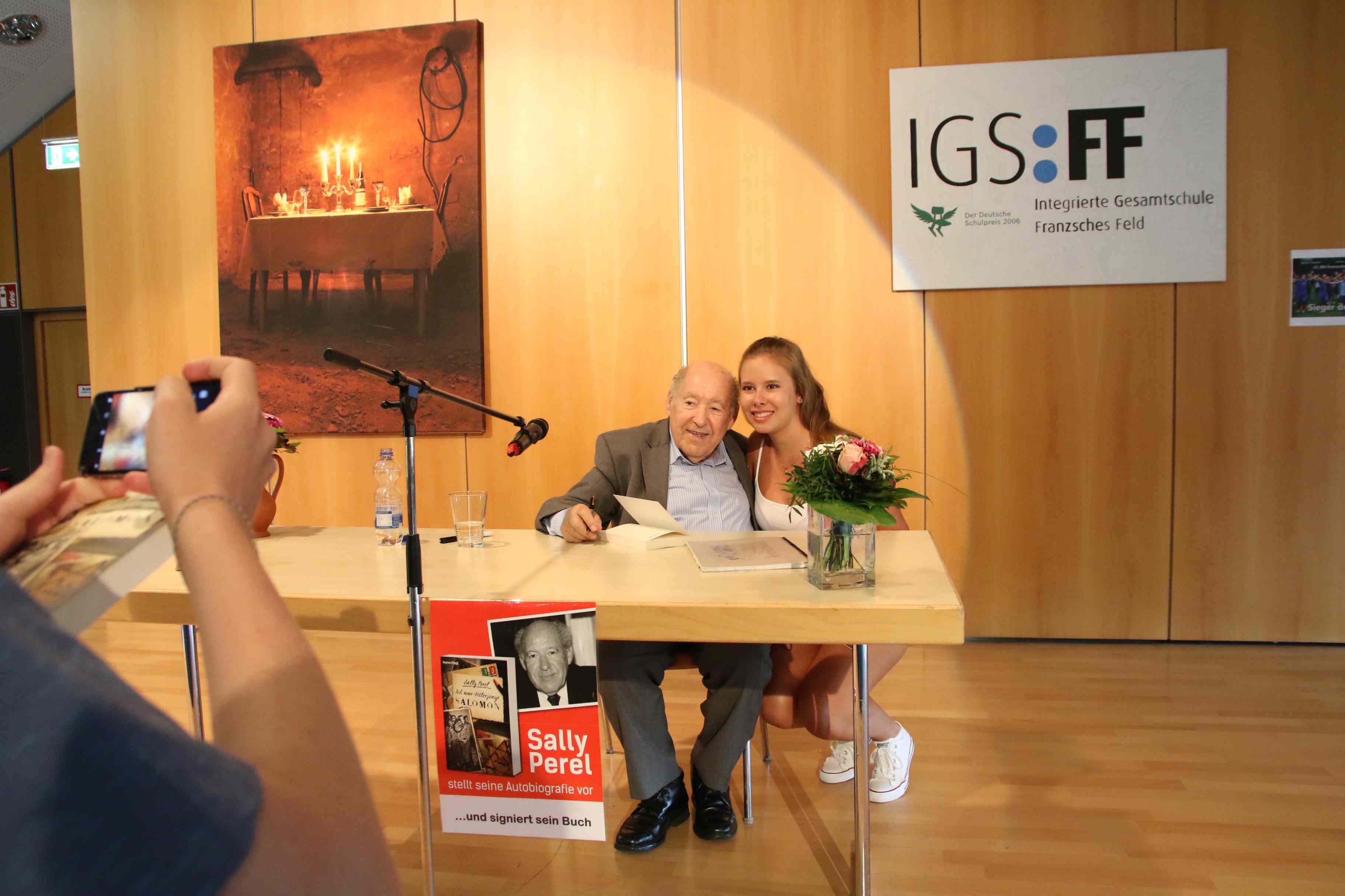 300 SchülerInnen der IGS:FF hörten schweigend und aufmerksam zu, als Sally Perel über den Abschied von seinen Eltern, von den Erlebnissen in der Hitlerjugend als Hitlerjunge Josef erzählt, können aber auch schmunzeln, wenn er von seinen Jugendlieben spricht. Das Bedrückende ist, dass er als Zeitzeuge deutlich machen kann, dass sich eine „heile Welt“, die er als Kind erlebte, zu einem Alptraum entwickelte, dass sich Menschen – wie wir alle – sich so veränderten, dass Millionen von Menschen getötet wurden – nicht von Monstern, sondern von Menschen!