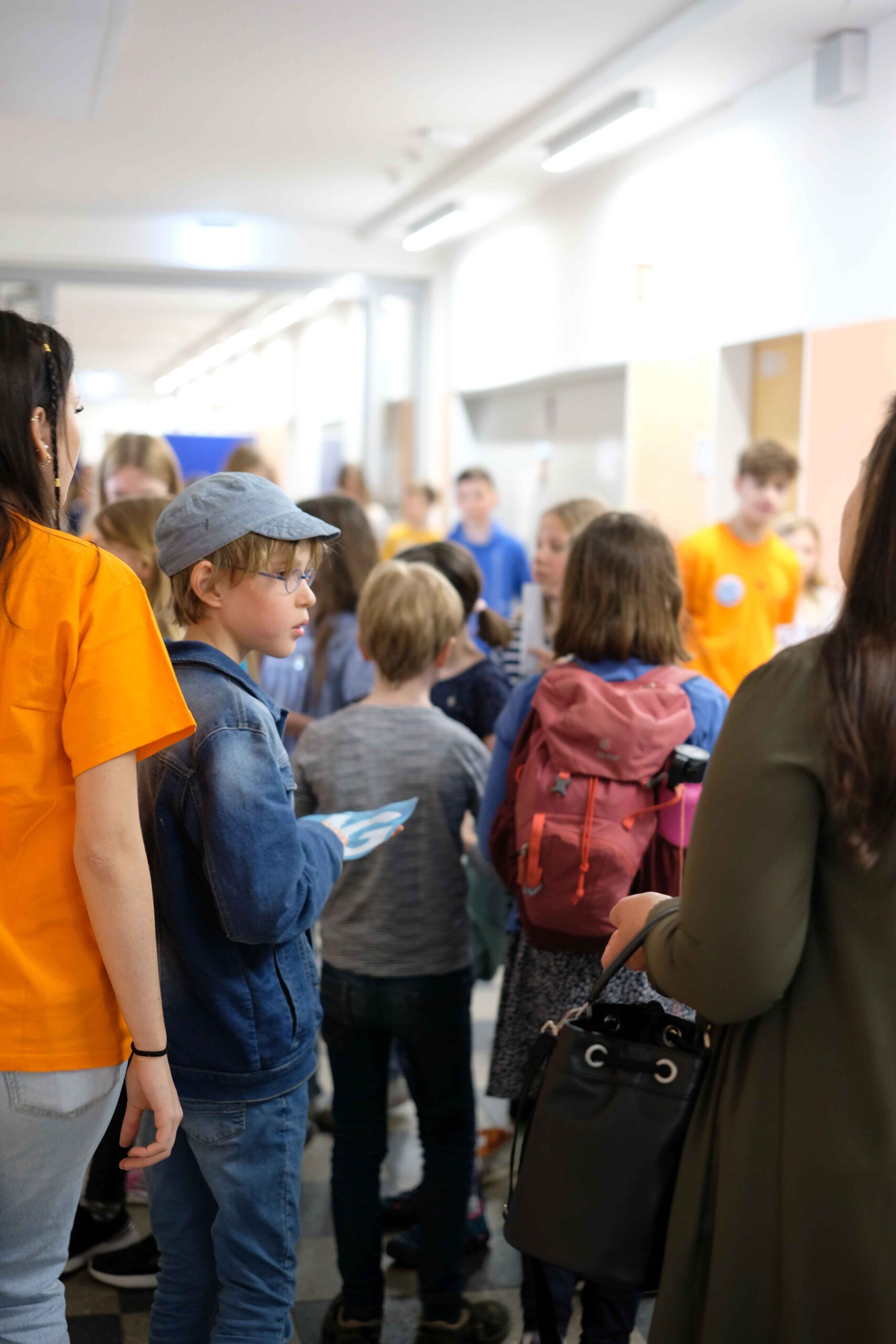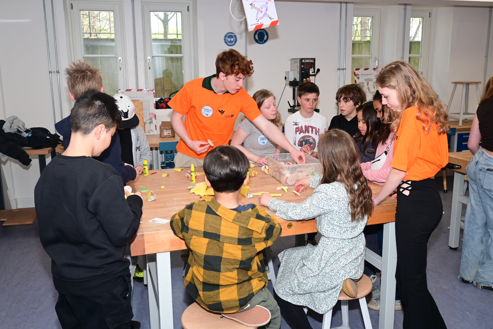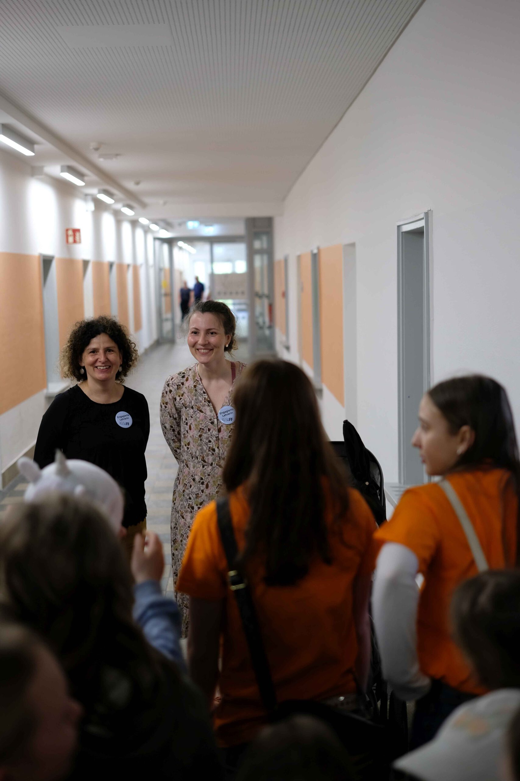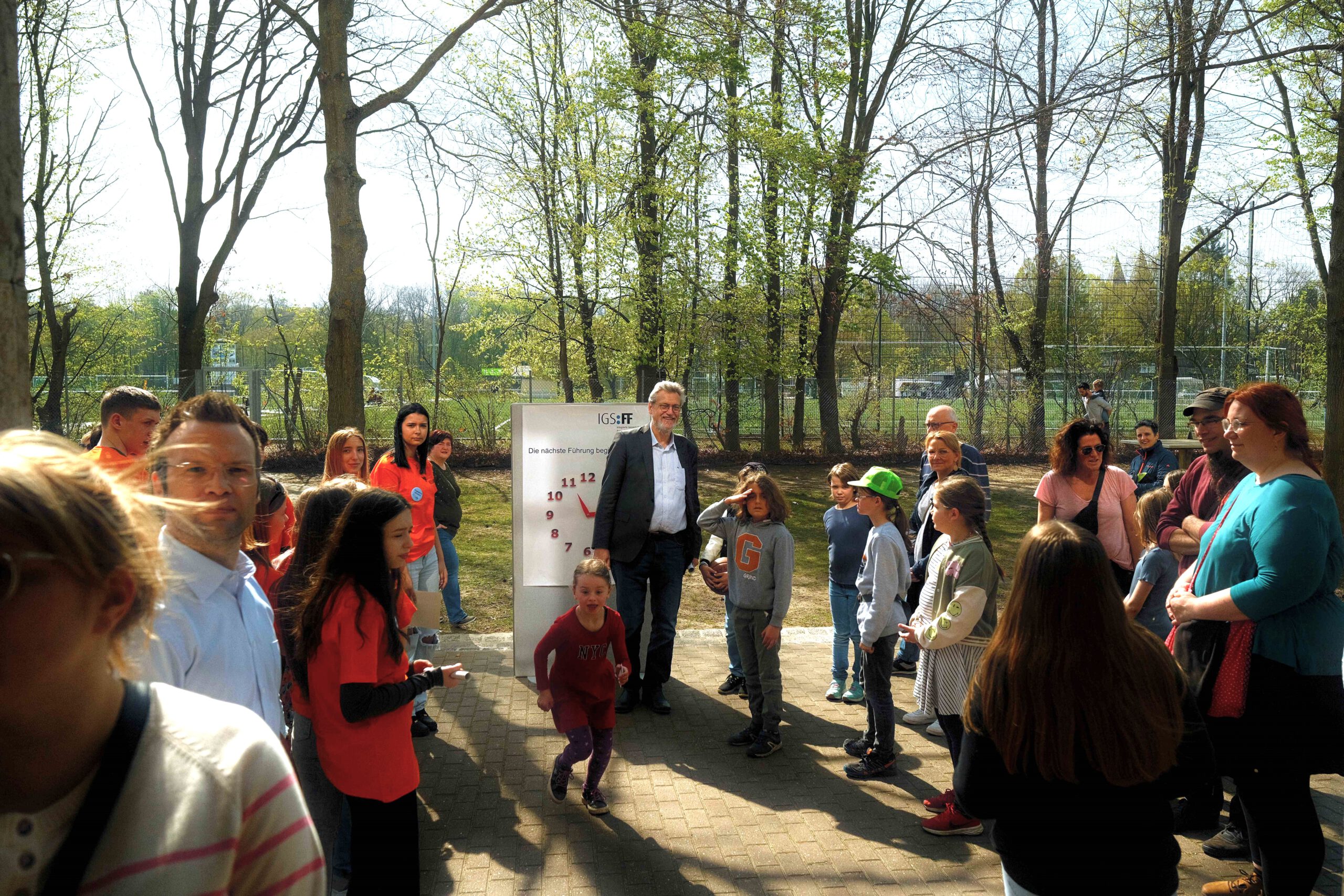 Schon am Empfang wurde durch die IGS:FF-Clowns für gute Laune gesorgt. Die Kinder konnten an verschiedenen Stationen durch geleitete Gruppen Einblicke in das Leben an der IGS:FF bekommen: Schüler:innen der Schule führten die Gruppen durchs Gebäude und das Schulgelände. Von mathematischen Spielen, über Kunst herstellen, über Buttons produzieren und Roboter steuern, über Märchen und Gesellschaftslehre mal anders kennenlernen, über Spaß an Sprachen und Darstellendem Spiel haben, bis zum Sozialen Training und dem Schulgarten mit dem Kaninchen – es gab viel zu entdecken und man hatte offensichtlich Spaß! Die Eltern konnten in der Zeit Kaffee und Kuchen beim Mensateam erhalten und sich mit Kolleg:innen und Eltern der Schule unterhalten.