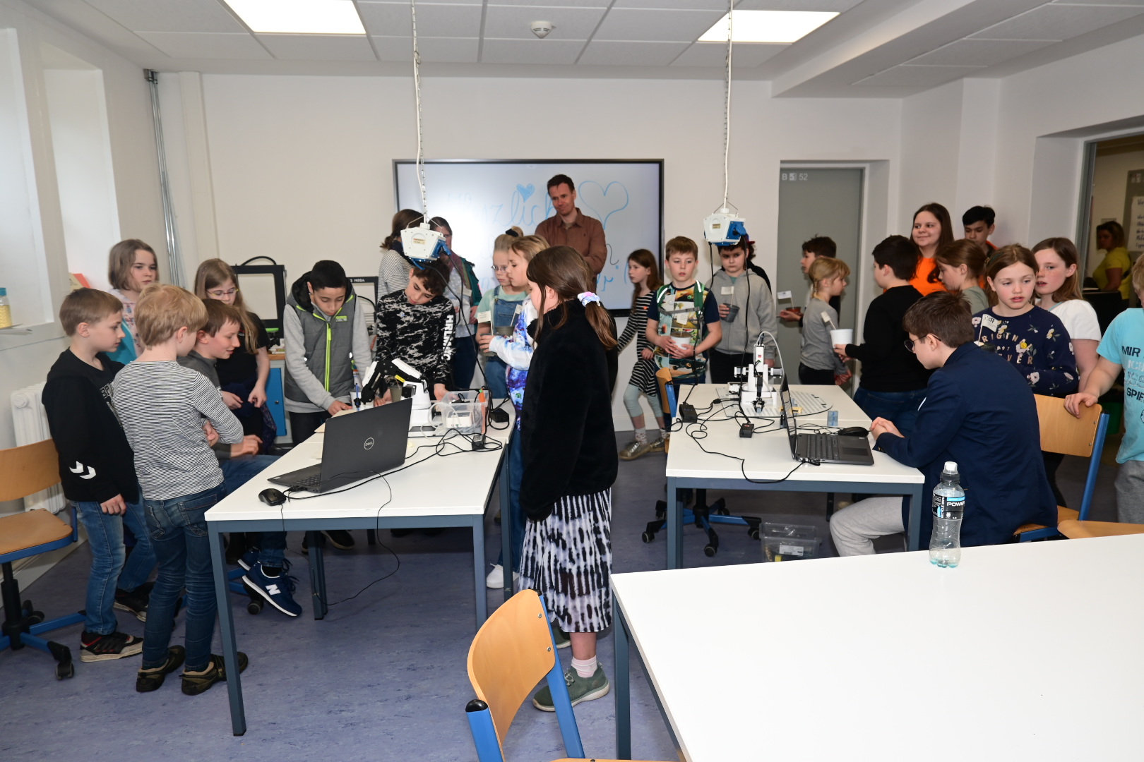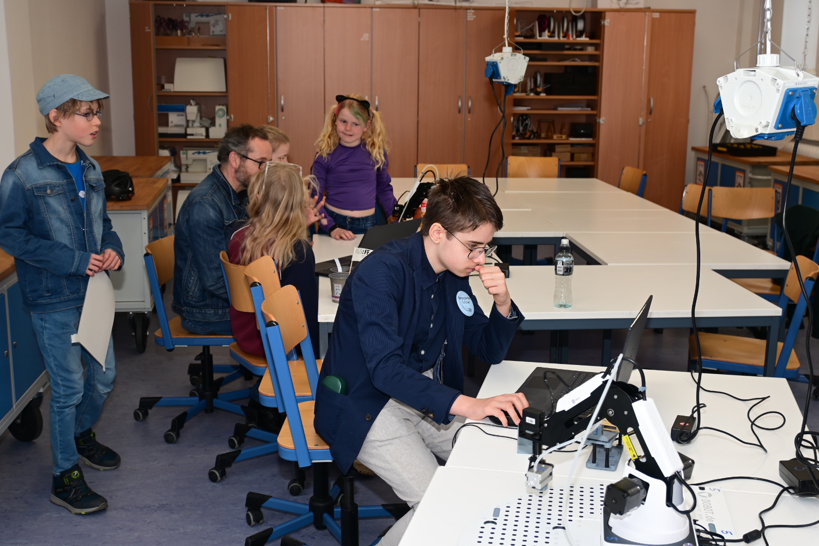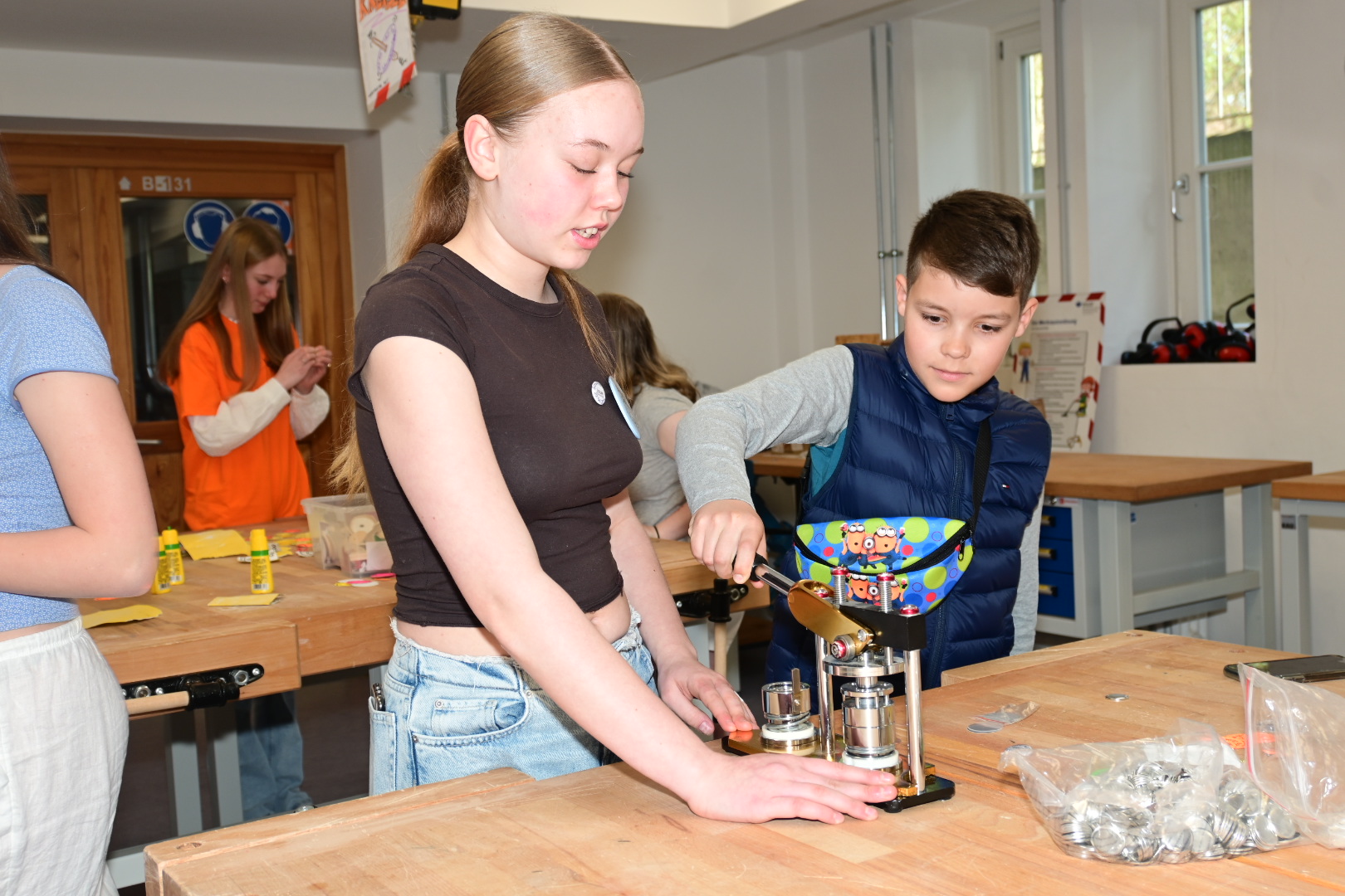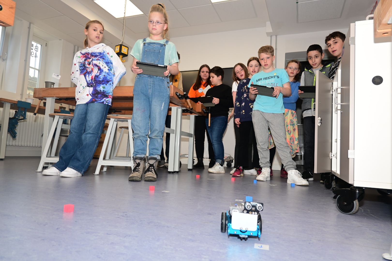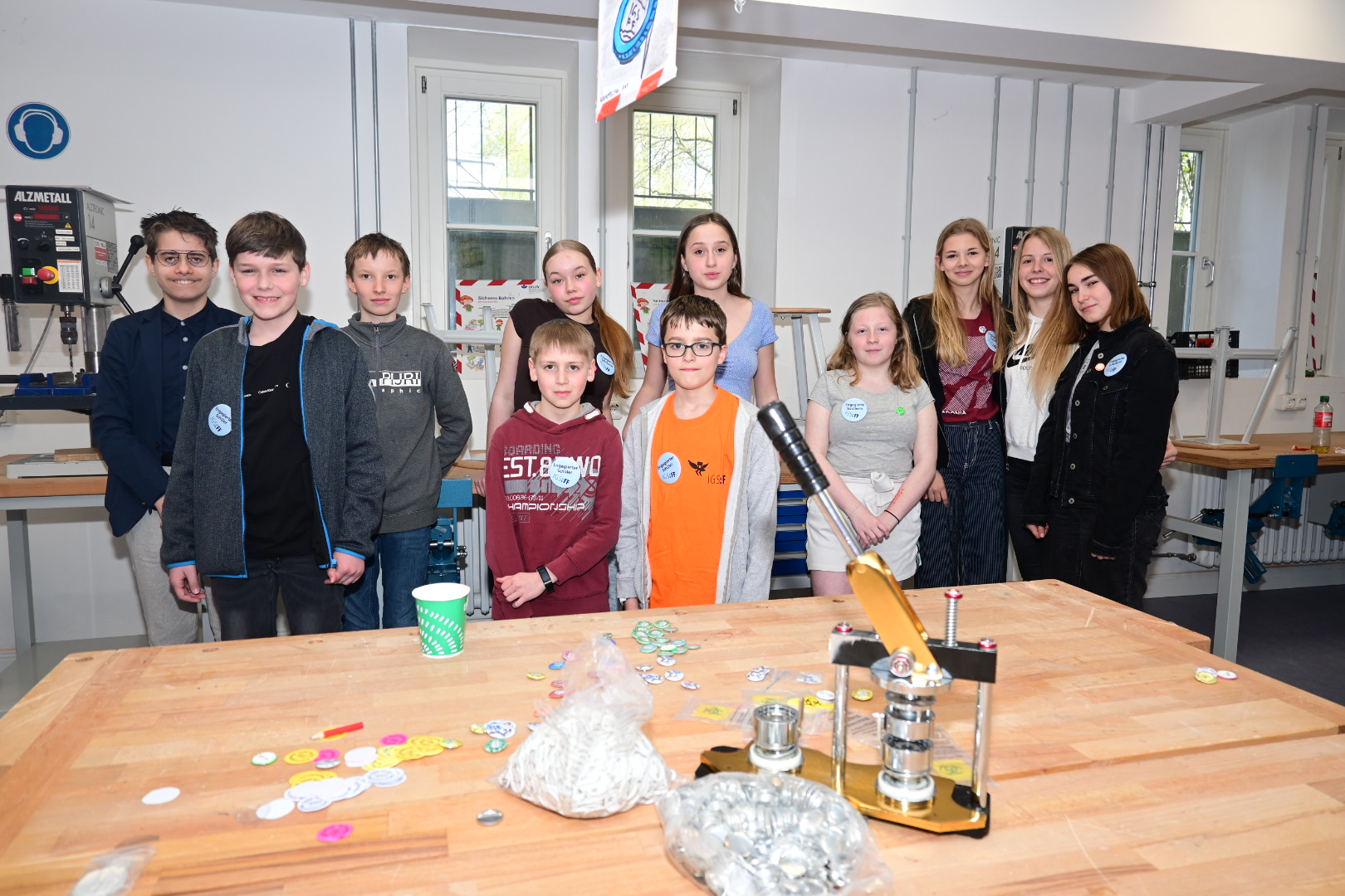 Schon am Empfang wurde durch die IGS:FF-Clowns für gute Laune gesorgt. Die Kinder konnten an verschiedenen Stationen durch geleitete Gruppen Einblicke in das Leben an der IGS:FF bekommen: Schüler:innen der Schule führten die Gruppen durchs Gebäude und das Schulgelände. Von mathematischen Spielen, über Kunst herstellen, über Buttons produzieren und Roboter steuern, über Märchen und Gesellschaftslehre mal anders kennenlernen, über Spaß an Sprachen und Darstellendem Spiel haben, bis zum Sozialen Training und dem Schulgarten mit dem Kaninchen – es gab viel zu entdecken und man hatte offensichtlich Spaß! Die Eltern konnten in der Zeit Kaffee und Kuchen beim Mensateam erhalten und sich mit Kolleg:innen und Eltern der Schule unterhalten.