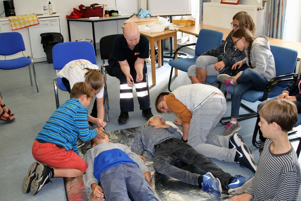 Eine Einweisung in die Ersthilfe bei Unfällen gab es durch Frau Wessel-Kropf und Herrn Molitor vom Arbeitersamariterbund (ASB), der auch für die Ausbildung und Betreuung unserer schulischen Ersthelfer zuständig ist. Tatkräftig unterstützt wurden sie dabei von unseren erfahrenen Ersthelfern Alina Heinecke und Max Bandau. Erfreulich ist, dass die Erste-Hilfe-AG unserer Schule dadurch vier neue engagierte Mitglieder aus der Klasse 5.4 gewinnen konnte.