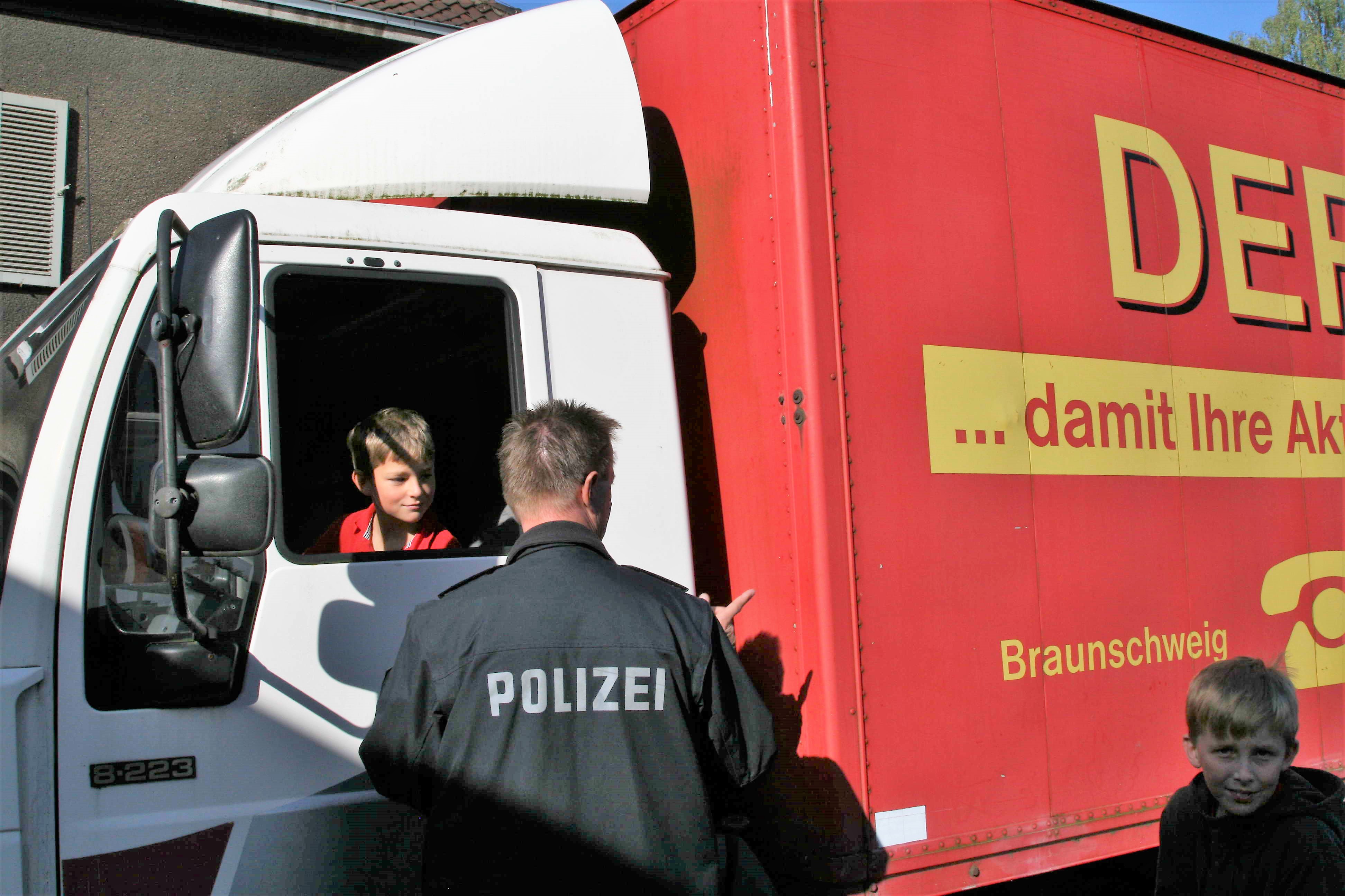 Die Stationen „Anhalteweg und Geschwindigkeitsdisplay“ und „Toter Winkel beim LKW“ wurden von Herrn Grünvogel und Herrn Weidemann von der Polizei begleitet. Die Fahrschule Busch stellte freundlicherweise wieder den LKW als praktisches Anschauungsmaterial zur Verfügung. So konnten die Kinder vom Fahrersitz aus selbst feststellen, wie eingeschränkt die Sicht eines LKW-Fahreres auf andere Verkehrsteilnehmer beim Abbiegen sein kann.