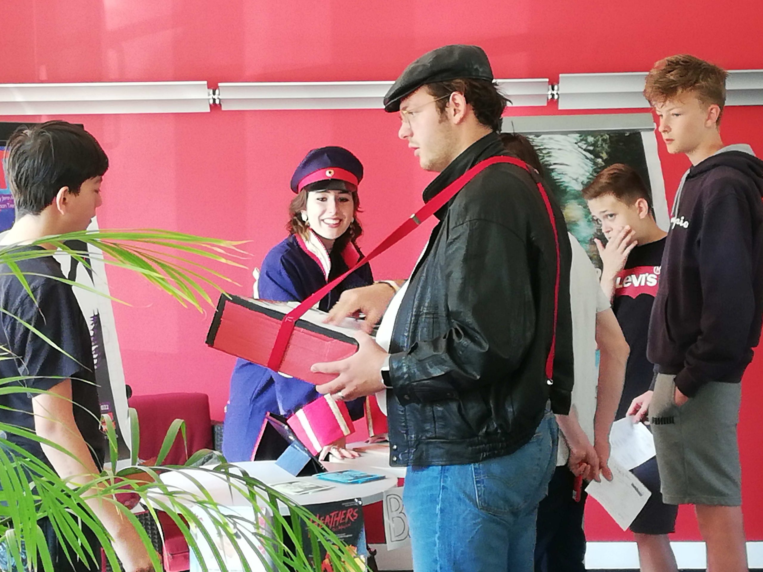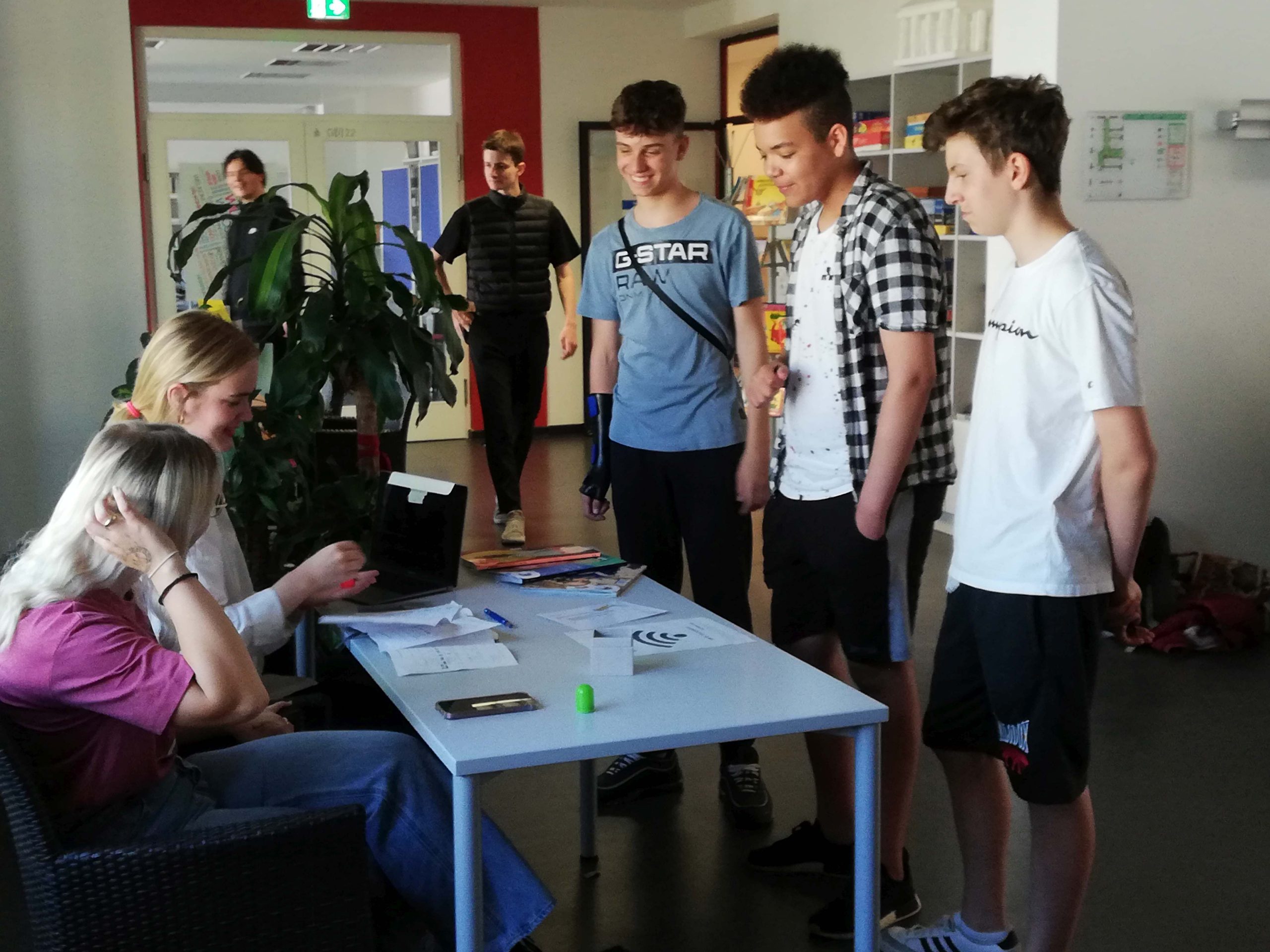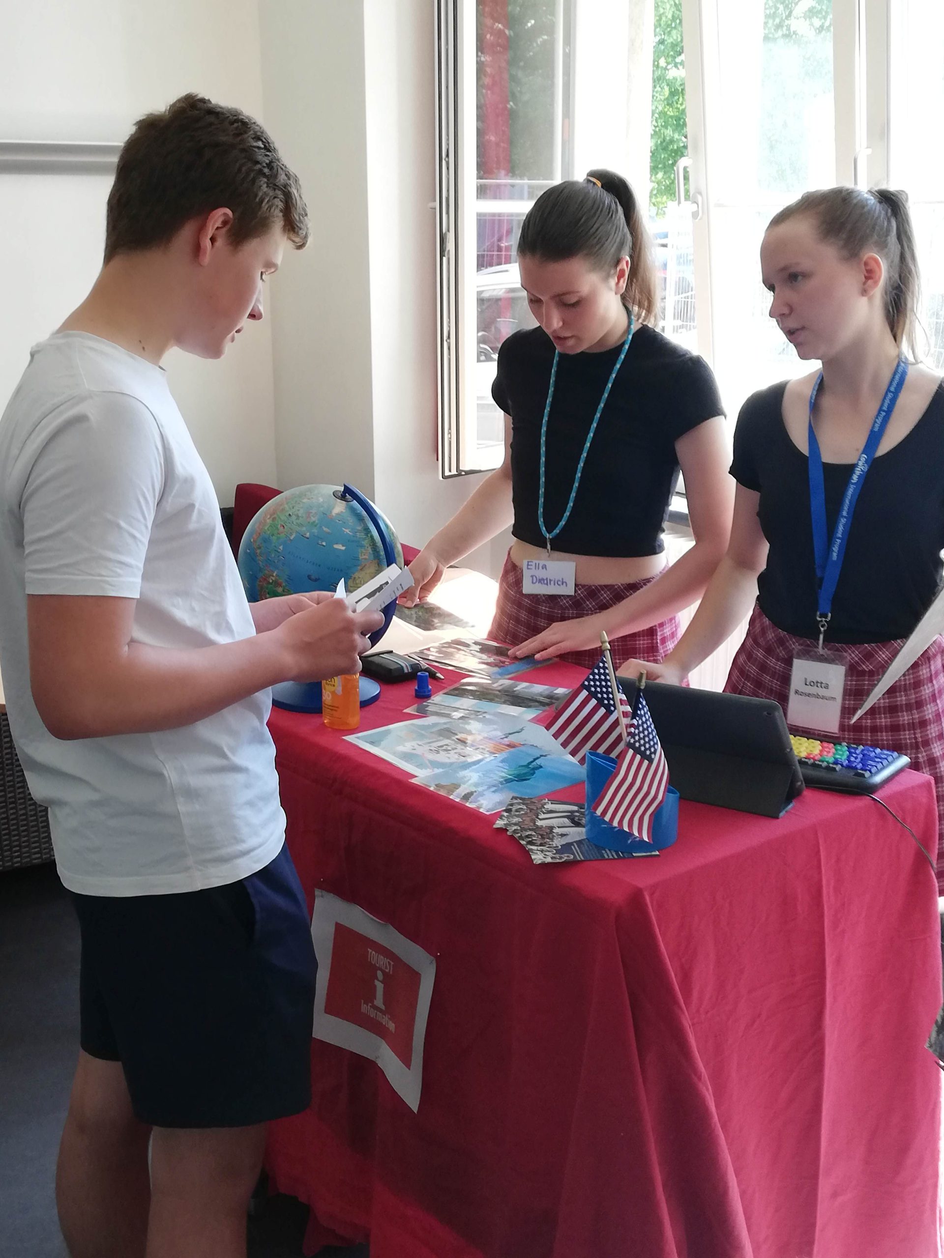 Am Mittwoch fand das Sprachendorf 12/8 “Welcome to New York!“ nach 2-jähriger Pause erstmals wieder statt. Als Brückenprojekt zwischen dem Deep-Profil (Leistungskurse Englisch, Politik und Deutsch) und dem 8. Jahrgang gedacht, konnten die Schüler:innen an zahlreichen Stationen ihre Englischkenntnisse erproben. Motiviert durch die Oberstufenschüler:innen legten alle nach und nach ihre Scheu vor der Fremdsprache ab und schwatzten nach kurzer Zeit fröhlich mit der Taxifahrerin oder den Damen, die ihre Hunde suchten. Angefangen von der Zollkontrolle am Flughafen, über den Check-in im Hotel oder der Suche des Koffers beim Fundbüro, wenn eine/r eine Reise macht, dann kann er/sie viel erzählen. Am Snack Shack gab es frische Waffeln, bevor eine Rundtour in der Tourist Information gebucht werden konnte. Sollten die Musicaltickets beim etwas suspekten Straßenhändler oder doch an der offiziellen Verkaufsstelle erworben werden? Der beste vintage Sports Shop in New York hatte ausgerechtet heute seinen Sale und lud zum Schnäppchen schlagen ein. Am Ende des Reise (manche hatten zwei Wochen gebucht ?? ) galt es das Erlebte den netten Hotelfachfrauen an der Hotelrezeption zu erzählen, bevor das gelbe Taxi erneut vorfuhr und die Gäste in Richtung JFK Flughafen aufbrechen mussten.
