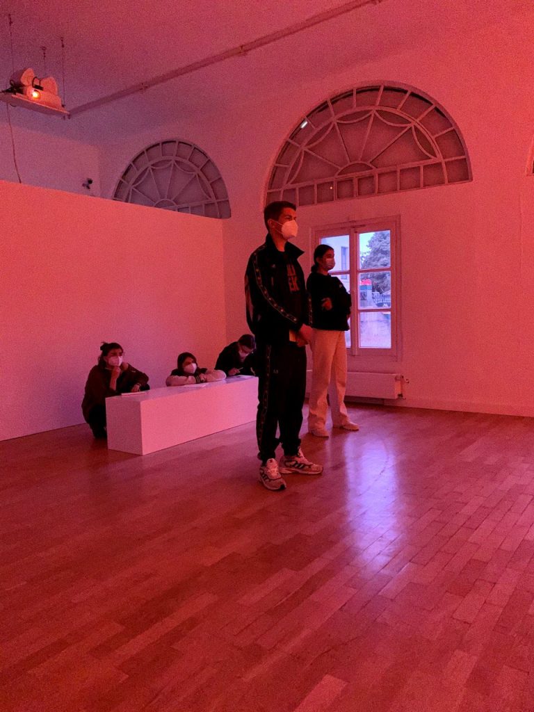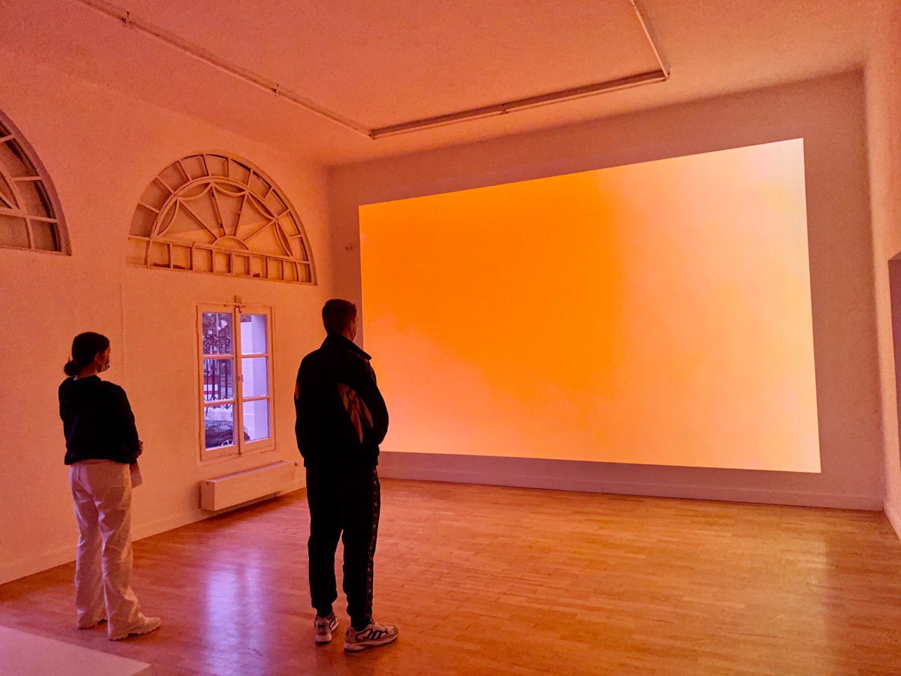 Nach einem ersten Rundgang durch die Ausstellung, welche überwiegend aus Filmen und Projektionen, aber auch Installationen und einigen Bildern bestand, bekam der Kurs die Aufgabe, auf das gesprochene und geschriebene Wort innerhalb der Kunstwerke zu achten. Dazu hat sich jeder mit einem eigenen Notizheft in den Räumlichkeiten bewegt, um einprägsame Wörter oder Sätze aufzuschreiben oder zu skizzieren. Nach einem kurzen Blitzlicht, indem jeder seine persönlichen Eindrücke, Empfindungen und Deutungen mit der Gruppe geteilt hat, schilderte Melina, dass sich die Ausstellung im Rhythmus der Gezeiten von Ebbe und Flut verändert. So ist zu jeder Tageszeit und von Tag zu Tag etwas anderes zu beobachten. Die Künstler*innen, so beschreibt es Melina, verbindet ein Interesse daran, neue Formen und Modelle des gesellschaftlichen Lebens, zwischen Mensch, Technik und Natur zu ergründen und abzubilden.