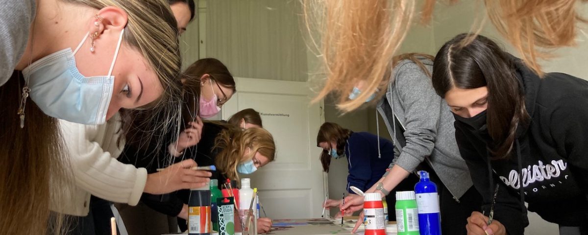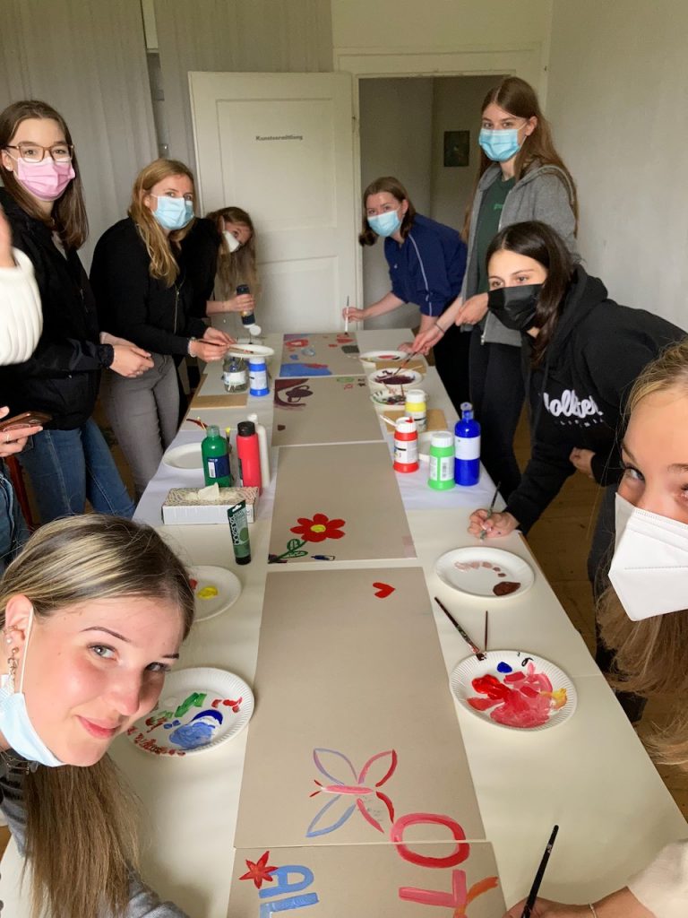 Nach einer kleinen Pause wurde mit einer praktischen Arbeit begonnen, bei der auf vier gleich großen Pappen jede Schülerin und jeder Schüler mit Acryl etwas gestalten konnte, dass ihn persönlich ausmacht. So ergab sich ein Werk aus vielen individuellen Einzelelementen, die sich zu einem Ganzen zusammenschließen lassen. Erst die Komposition aller Gestaltungen, bringt ein weiteres Bild hervor, ähnlich wie in der Duo-Ausstellung erst die Zusammensetzung aller Arbeiten ´Ebbe und Flut´ ergeben.