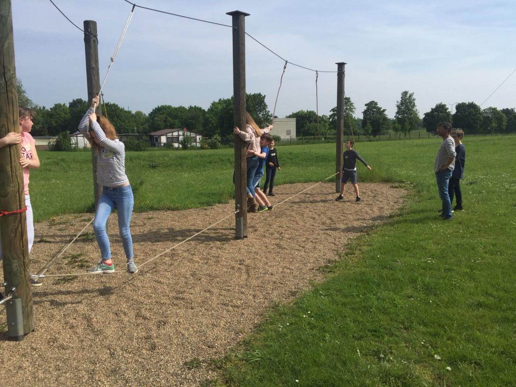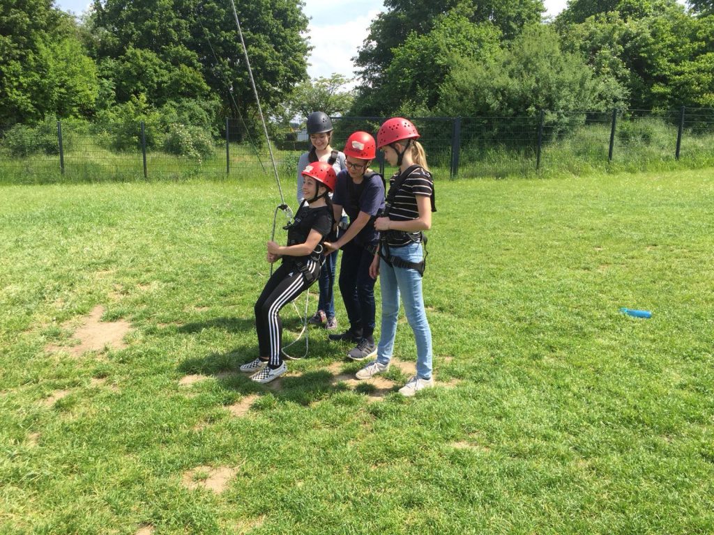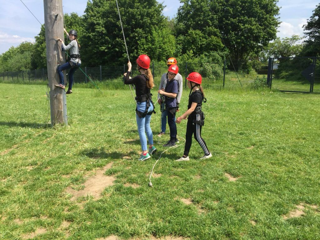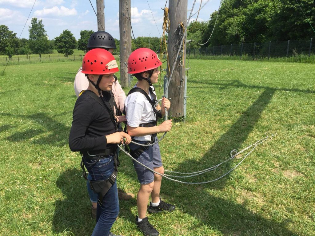Am Nachmittag ging es dann nach einer stärkenden Mittagspause am Buffet (Hähnchenschenkel, Tortilla, Börek und vieles mehr sorgten für die kulinarischen Highlights) in den Hochseilgarten. Zu dritt – mit einer Haupt- und einer Zweitsicherung sowie einem Anker – wurden die mutigen MitschülerInnen bei ihrem Aufstieg zum „Catwalk“, „Balancebeam“ oder zur „Coachingbridge“ am Seil gesichert. Alle SchülerInnen kamen dabei aus ihrer Komfortzone heraus und setzten sich der ein oder anderen Herausforderung aus. Dabei bewiesen viele ihren Mut und übertrafen sich selbst – Höhenängste wurden überwunden und eigene Grenzen erfahren. Lautes Gekreische beendete oftmals das letzte Element des Tages. Beim kurzzeitig fast freien Fall vom „High-all-aboard“ stürzten sich wagemutig immer drei Kinder gleichzeitig von einem kleinen Podest in neun Metern Höhe herunter, um nach einem Bruchteil einer Sekunde wieder sicher im Seil von den MitschülerInnen aufgefangen zu werden. Spätestens hier waren der Spaß und der Nervenkitzel den Meisten ins Gesicht geschrieben.