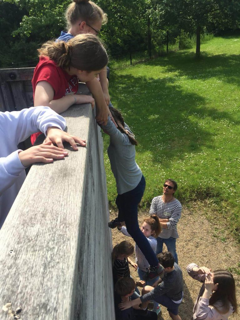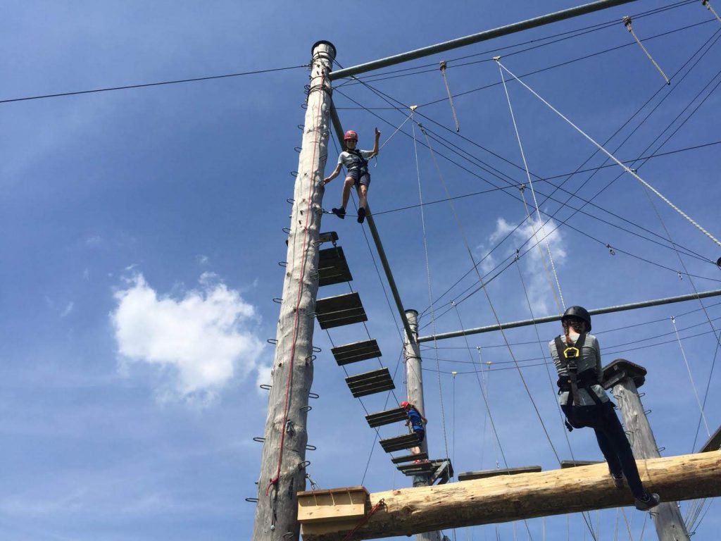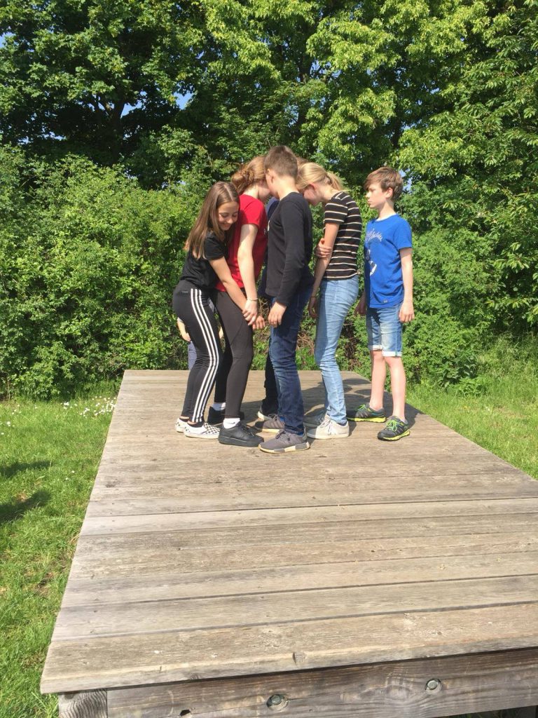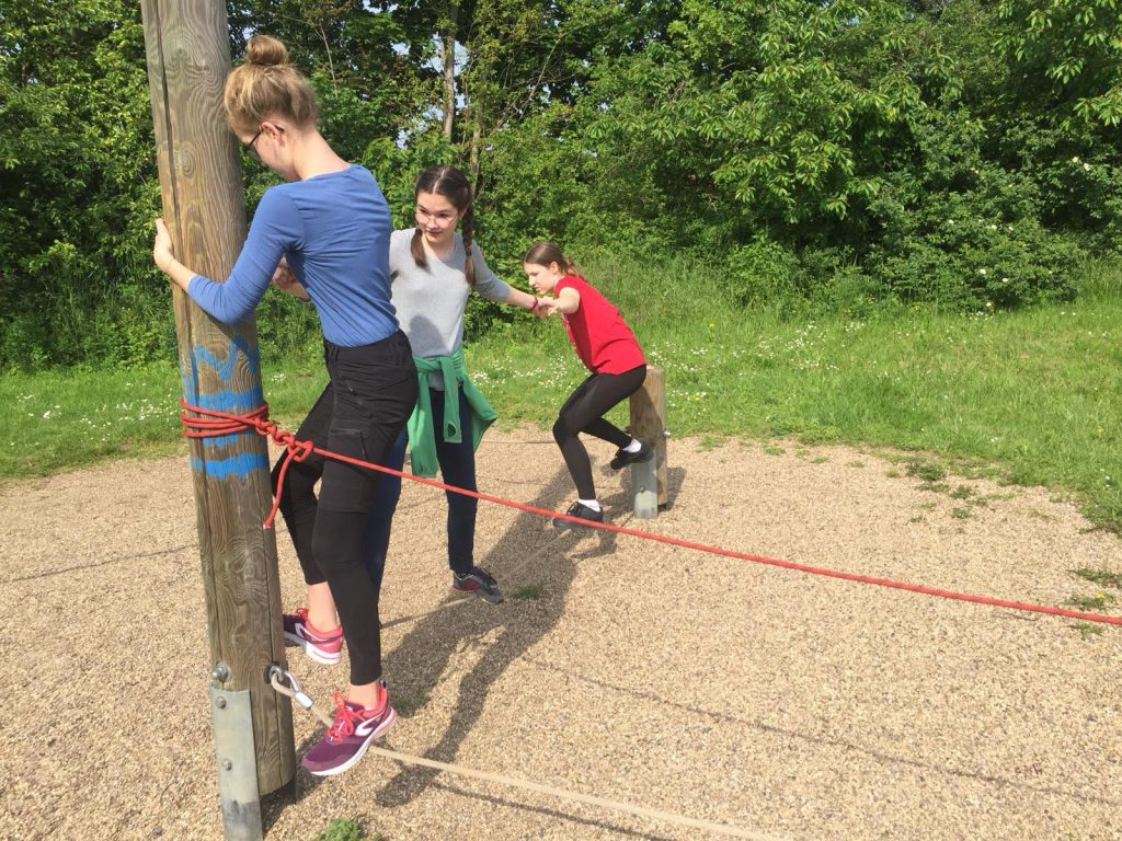 Am Nachmittag ging es dann nach einer stärkenden Mittagspause am Buffet (Hähnchenschenkel, Tortilla, Börek und vieles mehr sorgten für die kulinarischen Highlights) in den Hochseilgarten. Zu dritt – mit einer Haupt- und einer Zweitsicherung sowie einem Anker – wurden die mutigen MitschülerInnen bei ihrem Aufstieg zum „Catwalk“, „Balancebeam“ oder zur „Coachingbridge“ am Seil gesichert. Alle SchülerInnen kamen dabei aus ihrer Komfortzone heraus und setzten sich der ein oder anderen Herausforderung aus. Dabei bewiesen viele ihren Mut und übertrafen sich selbst – Höhenängste wurden überwunden und eigene Grenzen erfahren. Lautes Gekreische beendete oftmals das letzte Element des Tages. Beim kurzzeitig fast freien Fall vom „High-all-aboard“ stürzten sich wagemutig immer drei Kinder gleichzeitig von einem kleinen Podest in neun Metern Höhe herunter, um nach einem Bruchteil einer Sekunde wieder sicher im Seil von den MitschülerInnen aufgefangen zu werden. Spätestens hier waren der Spaß und der Nervenkitzel den Meisten ins Gesicht geschrieben.