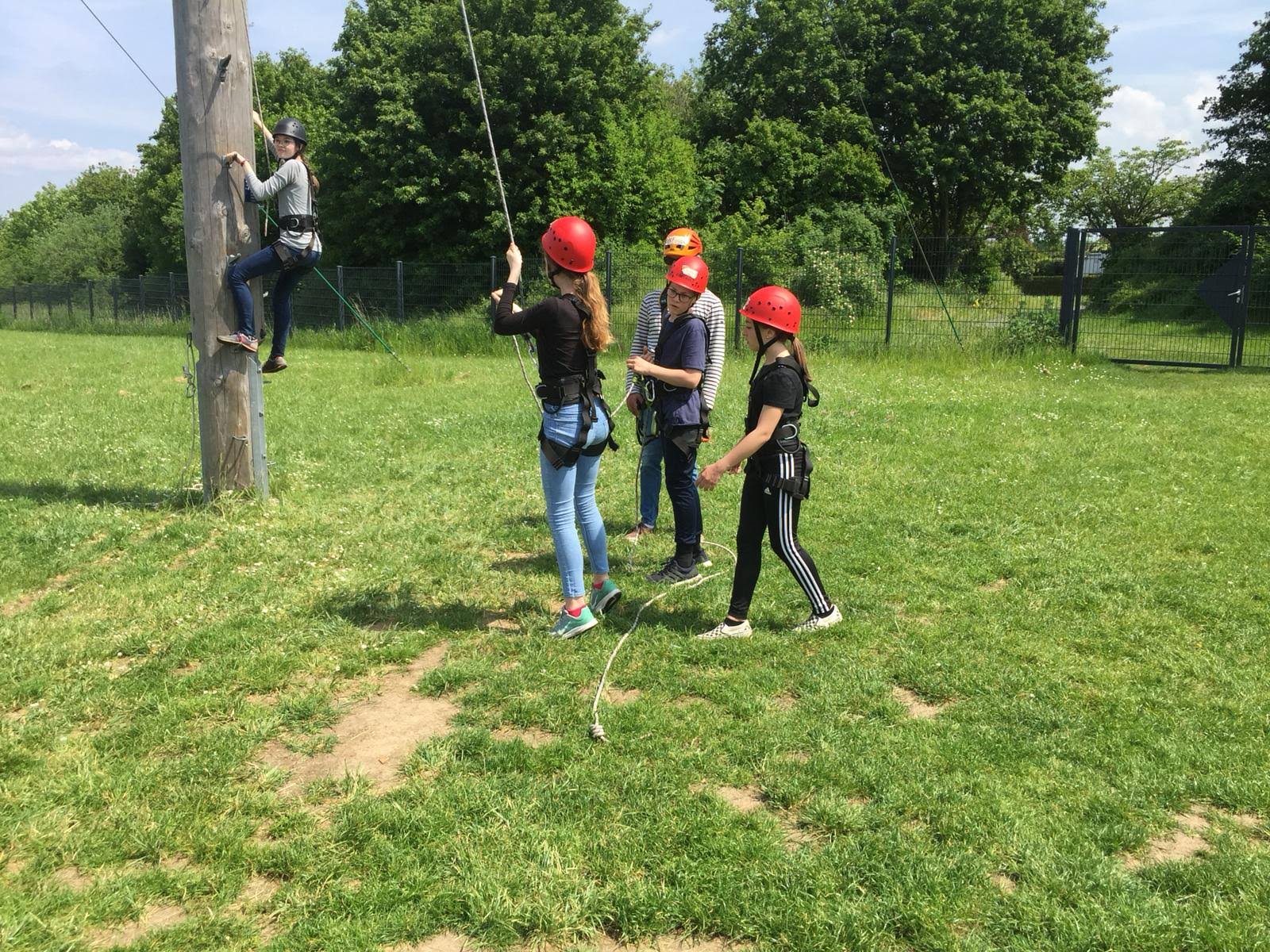 7. Juni 2019So lautete der einfache Merksatz, mit dem die SchülerInnen der Wahlpflichtkurse des 7. Jahrgangs das Sichern ihrer PartnerInnen im Hochseilgarten erlernten. In diesem Jahr fand das inzwischen schon traditionelle Teamtraining für die einzelnen WPBs erstmalig in Salzgitter statt.